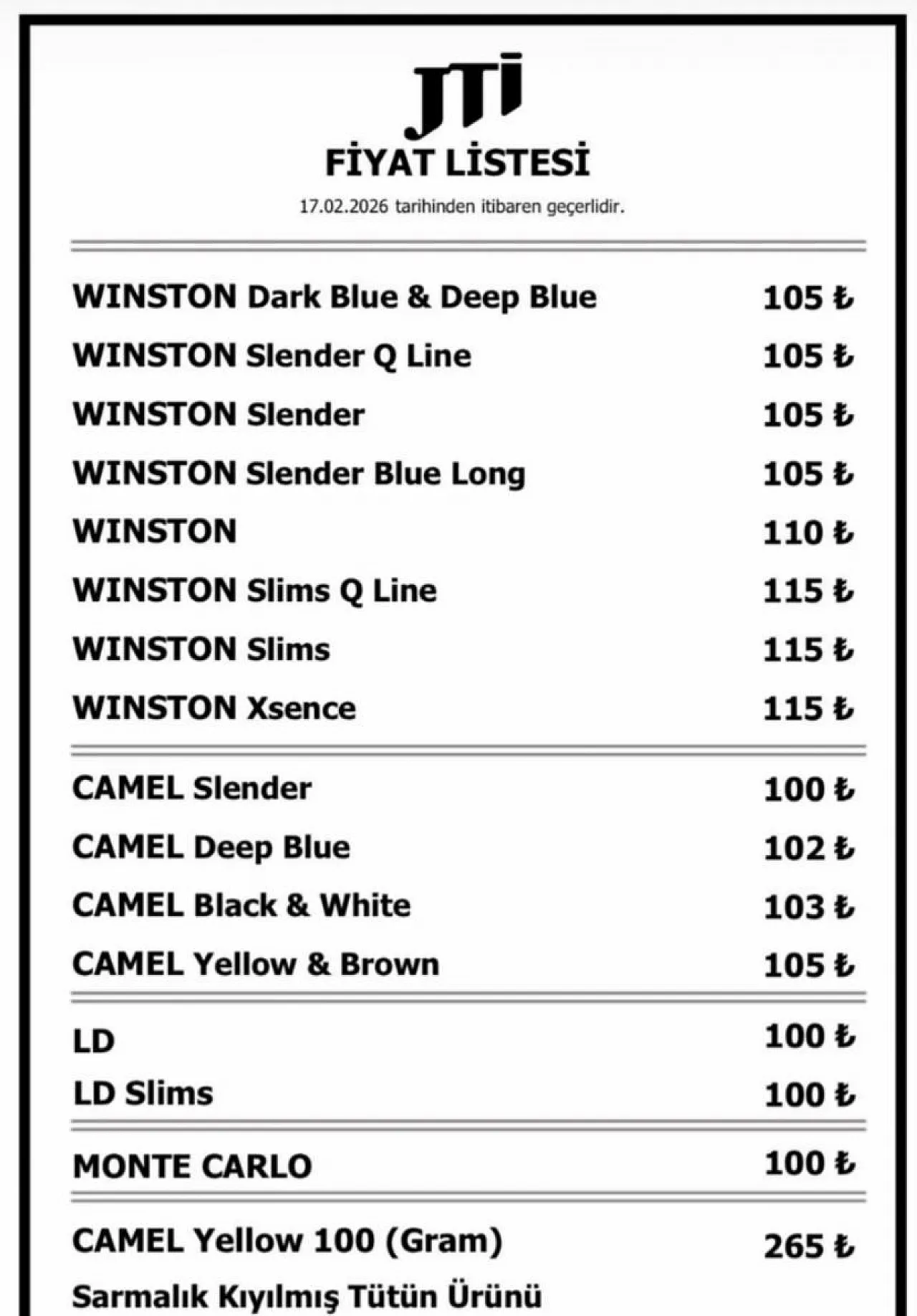Camel grubunda ise fiyatlar 100 lira ile 105 lira arasında güncellendi. CAMEL Slender 100 lira, CAMEL Deep Blue 102 lira, Camel Black & White 103 lira, Camel Yellow & Brown ise 105 lira olarak belirlendi.