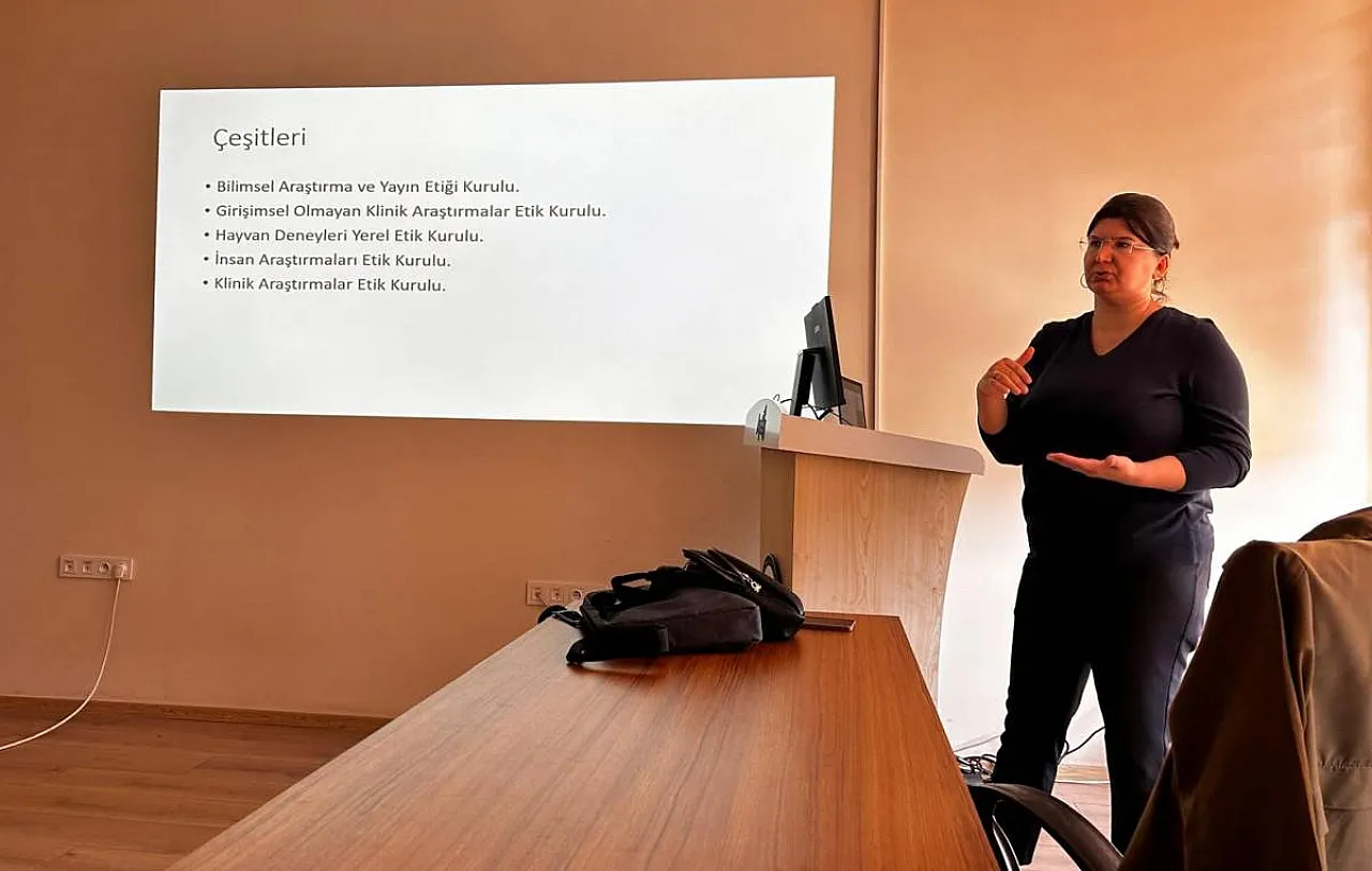 Dr. Öğretim Üyesi Fatma Özlem Kargın Solmaz, araştırma türlerine göre başvuru yapılması gereken Bilimsel Araştırma ve Yayın Etiği Kurulu, Girişimsel Olmayan Klinik Araştırmalar Etik Kurulu, Hayvan Deneyleri Yerel Etik Kurulu, İnsan Araştırmaları Etik Kurulu, Klinik Araştırmalar Etik Kurulu ile başvuru dosyasında bulunması gereken belgeler hakkında açıklamalar yaptı.