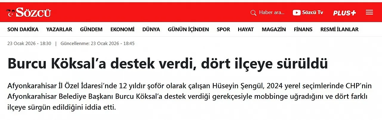 Cumhuriyet Halk Partisi’ne yakınlığıyla bilinen Sözcü gazetesi, Afyonkarahisar İl Özel İdaresi’nde çalışan bir kişinin, 31 Mart 2024 yerel seçimlerinde Cumhuriyet Halk Partili Burcu Köksal’ı desteklediği için sürgün yediği iddiasını ortaya attı. Bu haber kısa sürede sosyal medyada yayıldı ve konunun adaletsiz bir yaklaşım olduğu görüşü savunuldu.