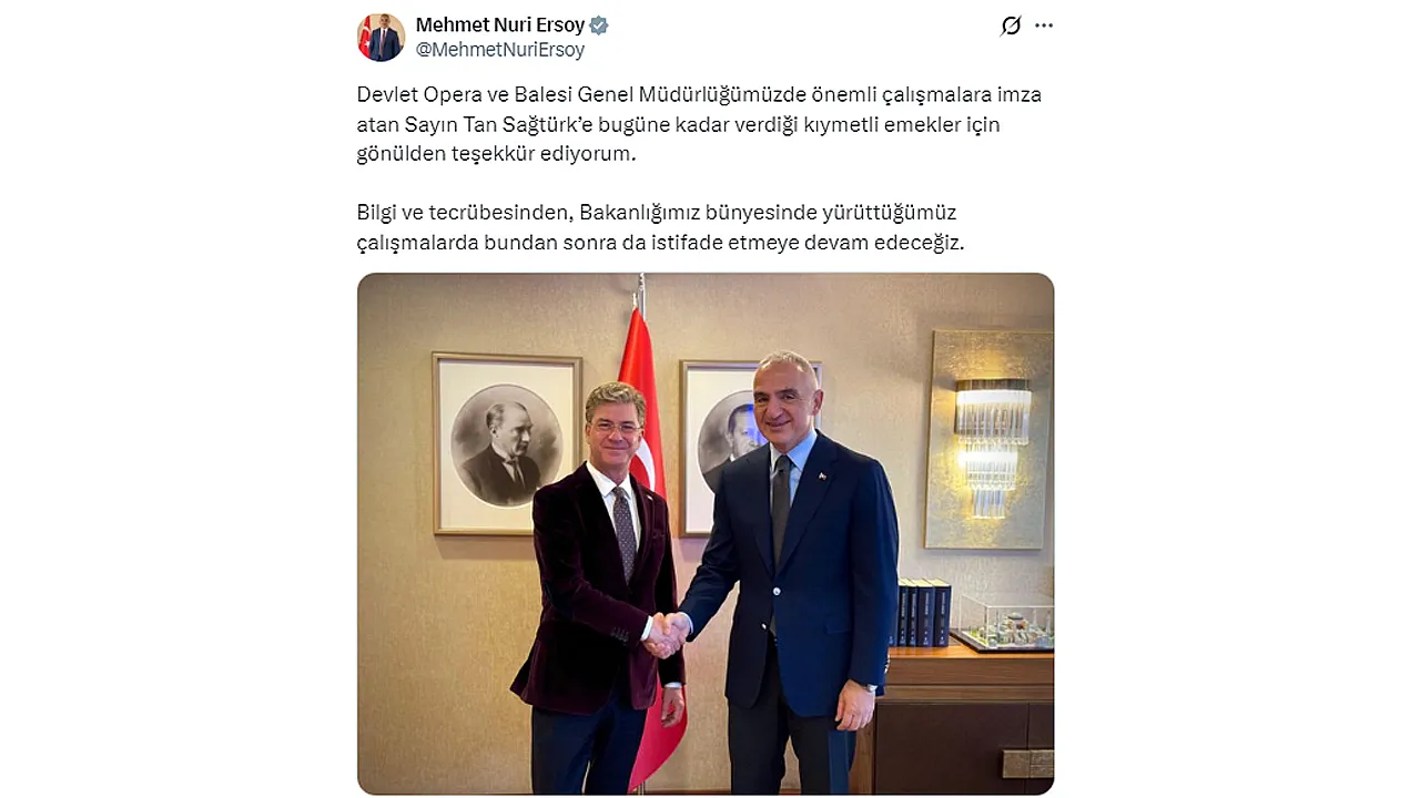 Kültür ve Turizm Bakanı Mehmet Nuri Ersoy, X hesabından yaptığı paylaşımla, Devlet Opera ve Balesi Genel Müdürlüğü döneminde önemli çalışmalara imza atan Bedri Tan Sağtürk’ten bakanlık bünyesinde de istifade etmeye devam edeceklerini belirtti. Bakan Ersoy yaptığı paylaşımda şu ifadelere yer verdi: