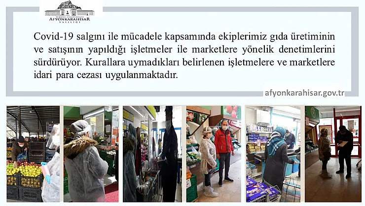 Afyonkarahisar Valiliği’ne bağlı ekipler koronavirüs salgını ile mücadele kapsamında gıda üretimi ve satışının yapıldığı işletmeler ile marketlere yönelik denetimlerini sürdürüyor. Gıda üretiminin ve satışının yapıldığı işletmeler ile marketlere yönelik yapılan denetimler kapsamında kurallara uymadıkları belirlenen işletmelere ve marketlere idari para cezası uygulandı.