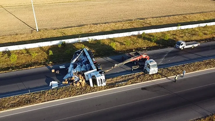 Afyonkarahisar’ın kontrolden çıkarak devrilen tekstil ürünleri yüklü tır karayolunun bir yönünü ulaşıma kapatırken, olayda sürücü yaralandı.
