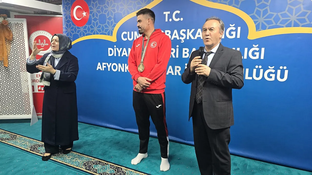 Engelsiz Kur'an Kursu öğrencisi ve İşitme Engelliler Milli Futbol Takımı sporcusu Emre Kılınç, Tokyo'da kazandığı altın madalyanın ardından Afyonkarahisar'da İl Müftülüğünün düzenlediği programda başarı plaketiyle onurlandırıldı.