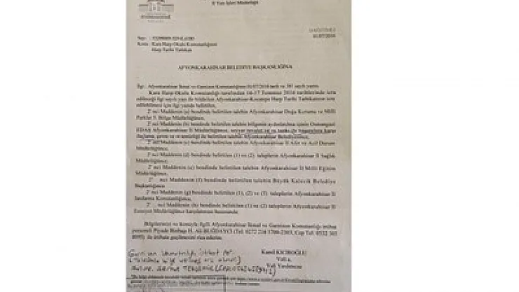 Kara Harp Okulu Komutanlığı’ndan gelen talep üzerine Afyonkarahisar Valiliği’nin ilgili kurumlardan tatbikat için gerekli işlemlerin sağlanmasını isteyen belgede imzası bulunan Vali Yardımcısı Kamil Kıcıroğlu, darbe girişimi sonrası açığa alınan isimler arasında yer alıyor.