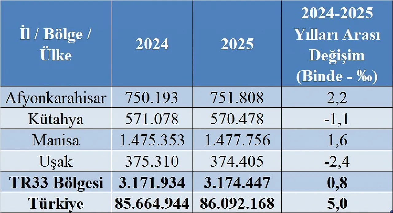 Türkiye İstatistik Kurumu’nun açıkladığı 2025 yılı nüfus verilerine göre Zafer Kalkınma Ajansı’nın faaliyetlerini sürdürdüğü TR33 Bölgesi’nde en çok nüfus artışı Afyonkarahisar’da gerçekleşti.
