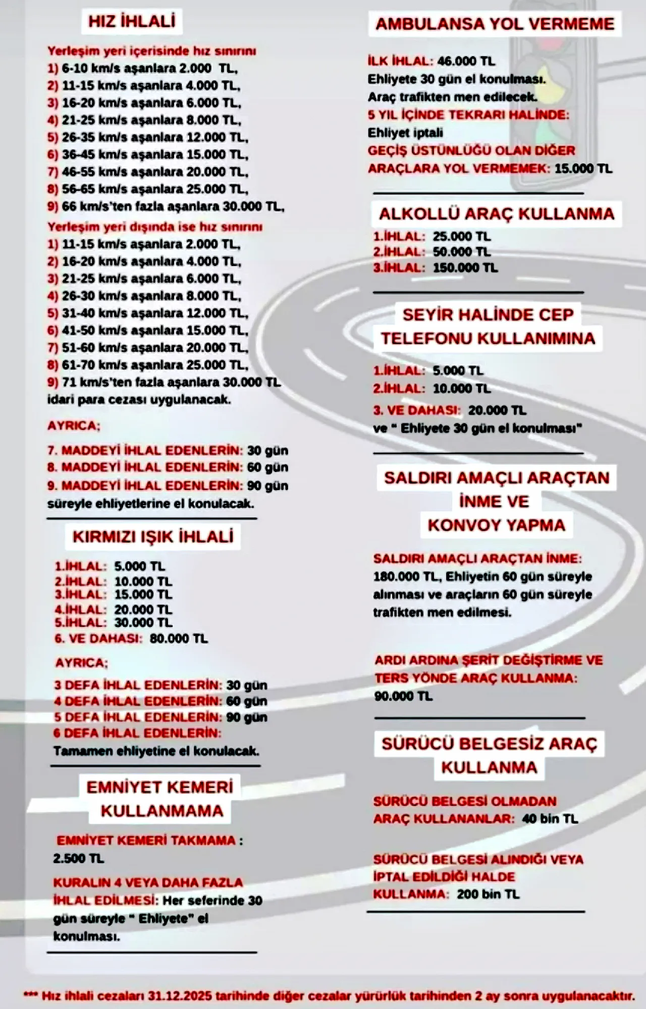 Yurtdışındaki gibi cezalar tekrarlandığında çok daha ciddi cezai yaptırımlar olacak. Emniyet kemeri takmamanın cezası şu an 993 lira. 2 bin 500 lira olması öngörülüyor. Kırmızı ışık ihlali şu an 2 bin 168 lira, 5 bin lira olması birinci ihlalde, ikinci ihlalde artarak devam edecek.