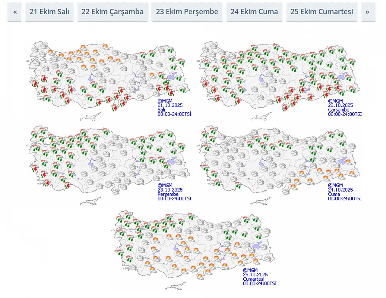Afyonkarahisar’da ise 21 Ekim 2025 Salı gününden itibaren Cuma gününe kadar yağışlı bir hava bekleniyor. Sıcaklıklar 9 ila 20 derece arasında seyredecek.