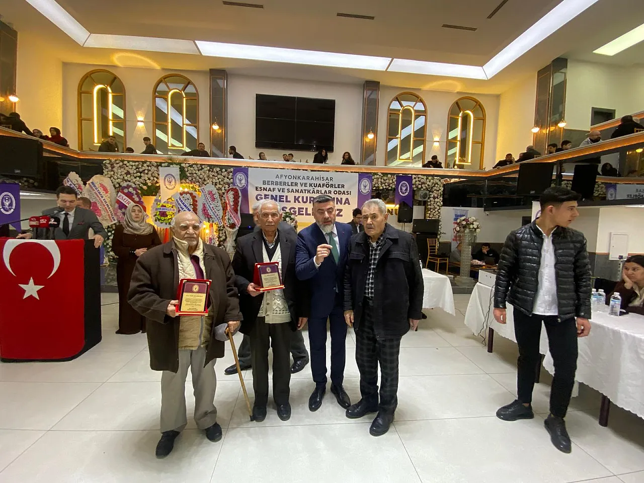 Afyonkarahisar'da berberlik ve kuaförlük mesleğinde 30, 40 ve 50'inci meslek yıldönümüne ulaşan ustalar plaket takdim edilerek onore edildi.