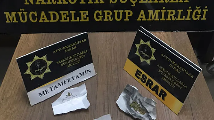 Dinar İlçesi’nde uyuşturucu operasyonunda yakalanan 2 şüpheliye adli işlem yapıldı   İlçe Emniyet Müdürlüğü Narkotik Suçlarla Mücadele Grup Amirliği ekipleri, kente, şüphe üzerine durdurduğu araçta bir miktar metamfetamin ile esrar ele geçirdi. Ekipler, araçtaki 2 şüpheliye adli işlem uyguladı. (AA)
