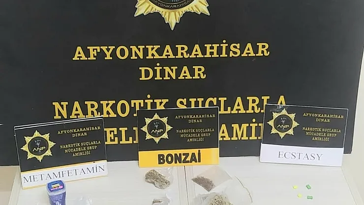 Olay, Dinar ilçe merkezinde meydana geldi. Edinilen bilgilere göre, ilçede denetim yapan Dinar İlçe Emniyet Müdürlüğüne bağlı Narkotik Suçlarla Mücadele Grup Amirliği ekipleri şüphe üzerine bir şahsı durdurarak üst aramasına yaptı. Aramada 4 parça halinde 26.16 gram sentetik kannabinoid, 0.79 gram tütünle karışık sentetik kannabinoid, 11.08 gram metamfetamin, 4 adet ecstasy hap ve 2 adet uyuşturucu kullanma aparatı ele geçirdi. Olayın ardından F.C., isimli şahıs hakkında gözaltına alındı.