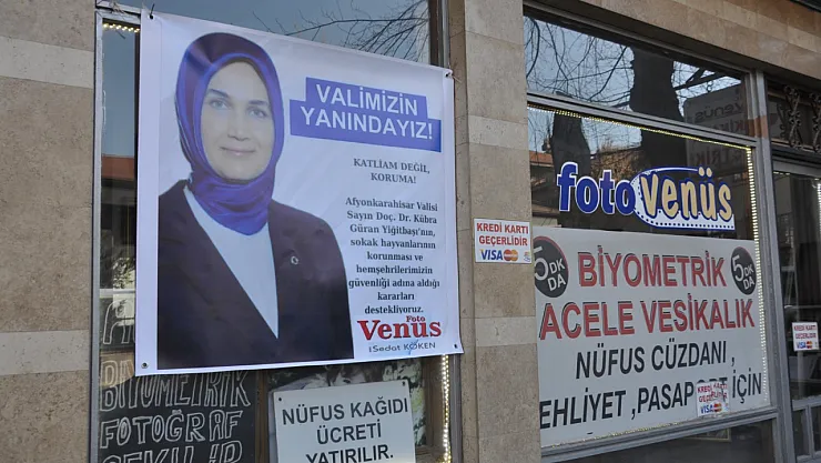 Afyonkarahisar Valisi Doç. Dr. Kübra Güran Yiğitbaşı'nın başıboş sokak hayvanları hakkında yayınladığı genelgeye, Afyonkarahisar'da bir esnaf işyerine astığı pankartla destek verdi