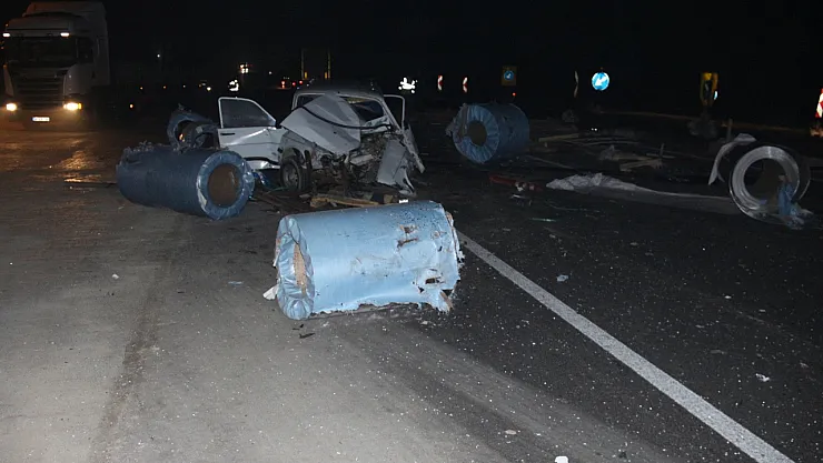 Afyonkarahisar'da bir tırın dorsesinden yola düşen ve her birinin ağırlığı yaklaşık 7.5 ton olan metal rulolar az kalsın faciaya neden olurken, rulolara çarparak hurdaya dönen bir otomobilin sürücüsü ağır yaralandı.