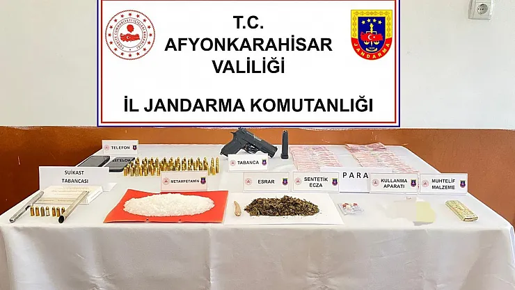 Y.Ç. ve Ş.Ç.’nin içinde bulunduğu araç, Antalya-Dinar Karayolu Gökçealan köyü mevkiinde yol kontrol noktasında Jandarma ekiplerince durduruldu. Adli makamlardan alınan arama kararına istinaden narkotik tespit köpeği ile birlikte araçta ve şüpheli şahısların üzerinde yapılan arama sonucunda; 300 gram metamfetamin maddesi, 50 gram skunk maddesi, 3 adet sentetik ecza hapı, 1 fişek kullanıma hazır esrar maddesi, 1 adet uyuşturucu kullanma aparatı 1 adet tabanca, 2 adet şarjör, 74 adet tabanca fişeği, 1 adet suikast tabancası, 7 adet tabanca fişeği, 15 bin 200 TL suçtan elde edildiği değerlendirilen nakit para, 2 adet cep telefonu ele geçirildi. Yakalanan şahıslar gözaltına alındı; meydana gelen olayla ilgili adli tahkikata başlandı.