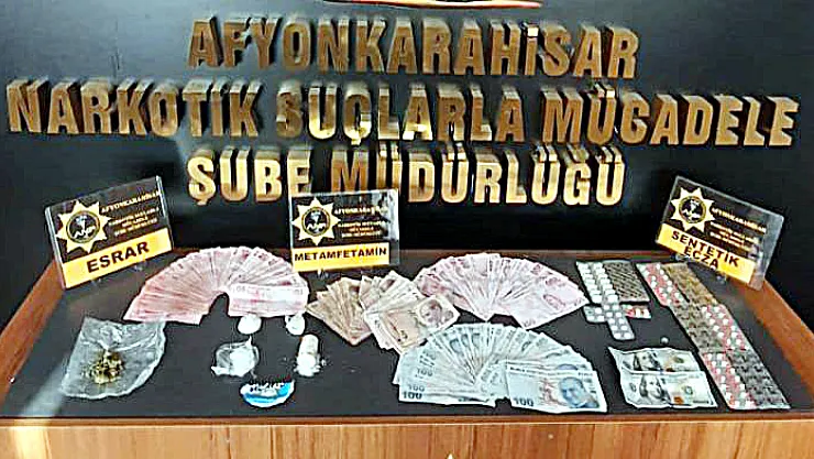 Afyonkarahisar İl Emniyet Müdürlüğü Narkotik Suçlarla Mücadele Şube Müdürlüğü ekiplerince, Uşak yolunda yapılan uygulamada; 27,41 gram metamfetamin, 115 adet sentetik ecza, 3,71 gram esrar, 10 bin 500 TL ve 200 Amerikan doları suçtan elde edildiği değerlendirilen para ele geçirildi.