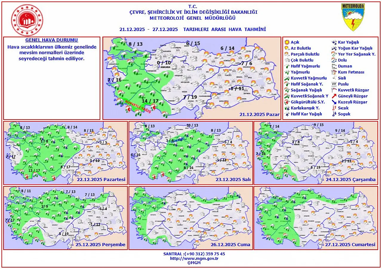 Meteoroloji Genel Müdürlüğü'nden alınan yapılan tahminlere göre; hava sıcaklığı, mevsim normallerinin üzerinde seyredecek. Sabah ve gece saatlerinde iç ve doğu bölgelerde pus ve yer yer sis bekleniyor. Rüzgarın genellikle güney ve doğulu, yurdun kuzeybatı ve güneydoğu kesimlerinde kuzeyli yönlerden hafif, ara sıra orta kuvvette esmesi bekleniyor.